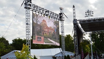 If space is a consideration or if you prefer the look, we recommend flat panel displays as a possible solution. These are available in sizes ranging from a 24 inch confidence monitor to a huge 80 inch LED big screen. If multiple units are ordered we make sure they are identical. All of our TVs are kept in perfect condition and these can be either flown from an overhead truss or mounted to a truss tower and base plate as shown here. We cover our truss stands in black spandex to hide all of the cabling and give the completed structure a super clean finished look
